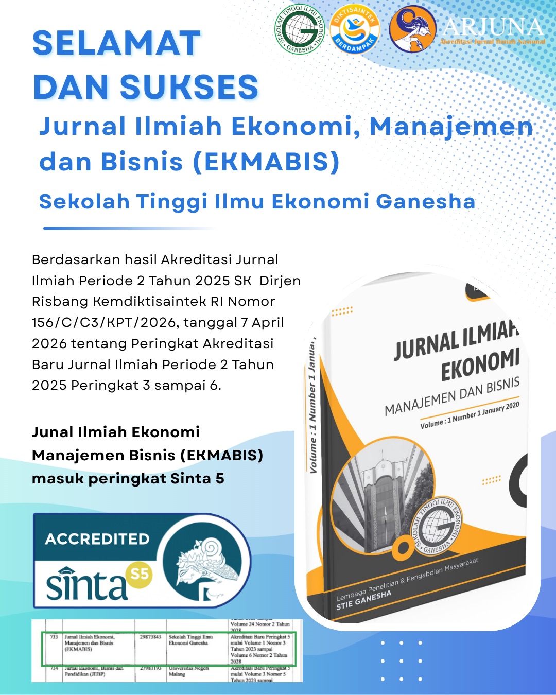 LPPM STIE Ganesha Cetak prestasi, jurnal ekmabis stie ganesha resmi raih akreditasi sinta... Sitti Aliyah Azahra 09 April 2026